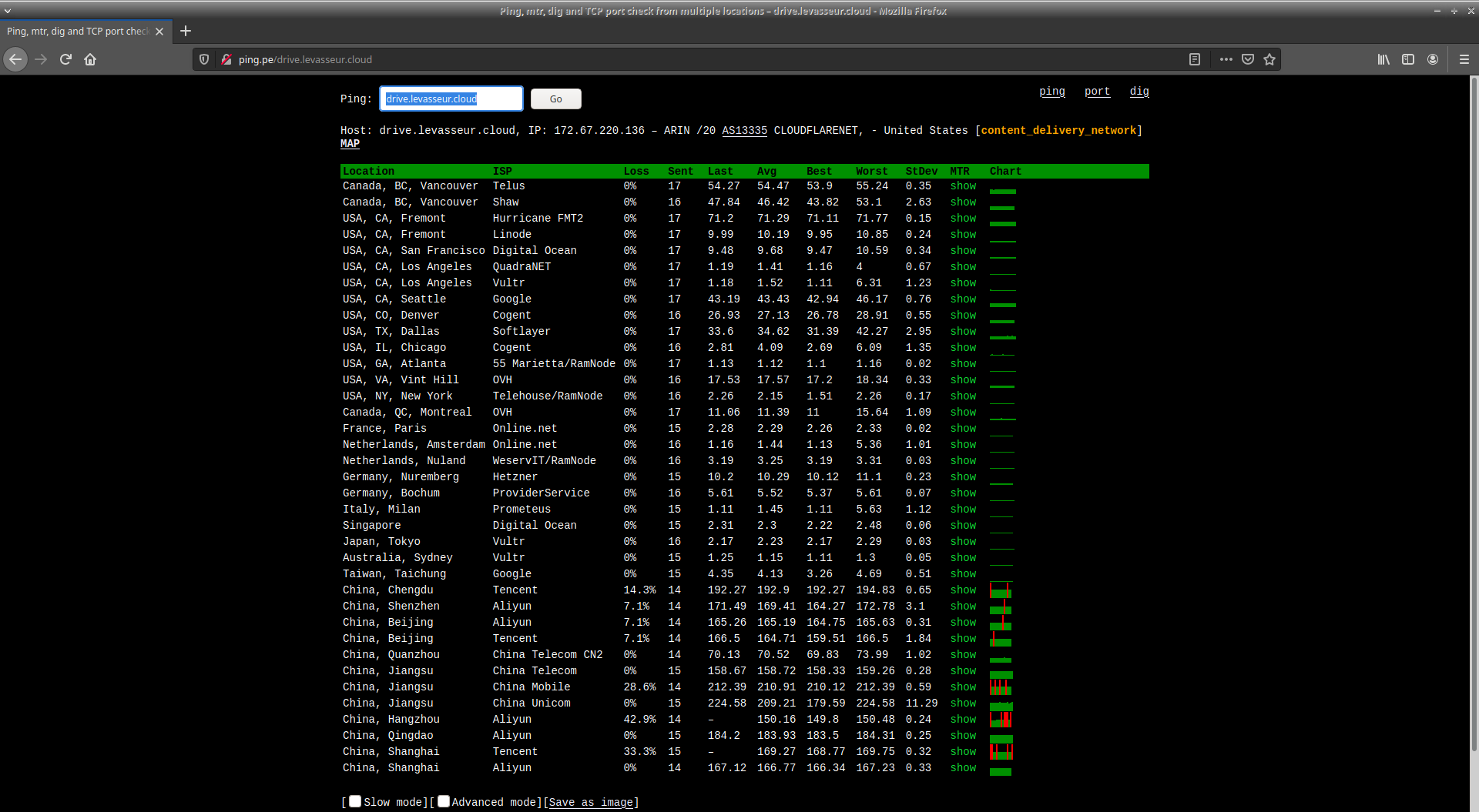 Du fait de ma faible connexion Internet ADSL, et pour d'autres raisons, j'ai choisi de rendre mes services accessibles sur l'Internet au travers d'un CDN. En dehors du réseau interne c'est donc par l'intermédiaire de Cloudflare que les services sont délivrés.