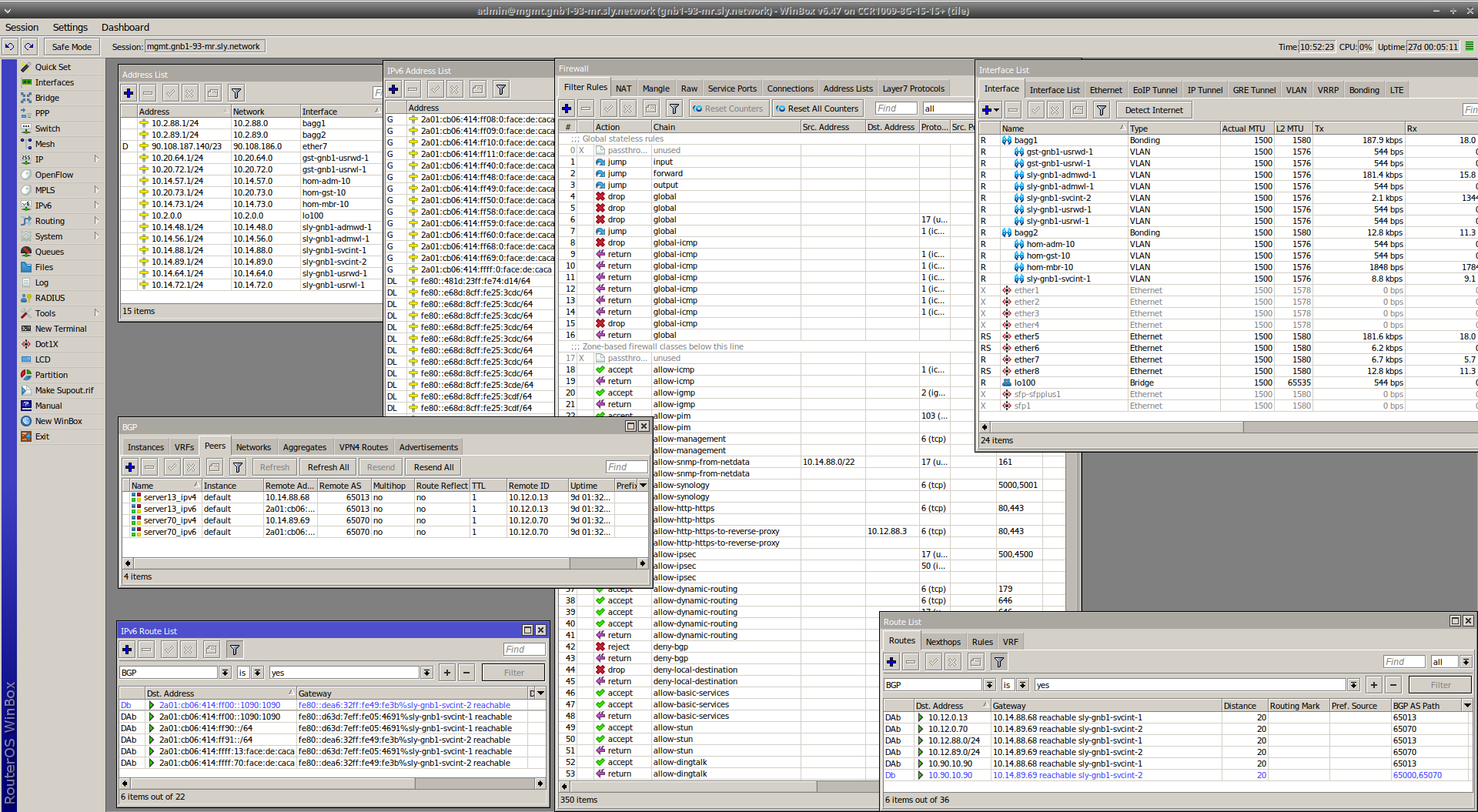 Le routeur fait aussi office de pare-feu. Concrètement, MikroTik est une surcouche à Linux. Ainsi le pare-feu c'est grossièrement de l'iptables. De là, j'y ai implementé le concept de zone-based firewall. Je classifie le trafic, je définis des politiques, j'applique des politiques à des classes de trafic. Au total ça donne environ 350 règles IPv4 et le même nombre pour IPv6.